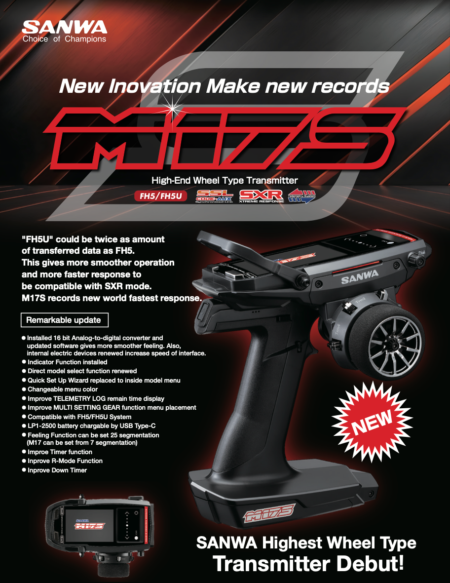 The Sanwa M17S FH5/FH5U 4-Channel 2.4GHz Radio System redefines RC control with groundbreaking features and unmatched performance. Equipped with a 16-bit analog-to-digital converter and updated software, it delivers ultra-smooth operation and fast response times. Innovations include FH5U compatibility for increased data transfer, a customizable menu interface, USB Type-C charging for the LP1-2500 battery, and an advanced telemetry log display. Unique features like Motion Steering and enhanced setup tools make the M17S the ultimate choice for precision and control, ensuring it's ready for both today’s demands and future advancements in RC technology.