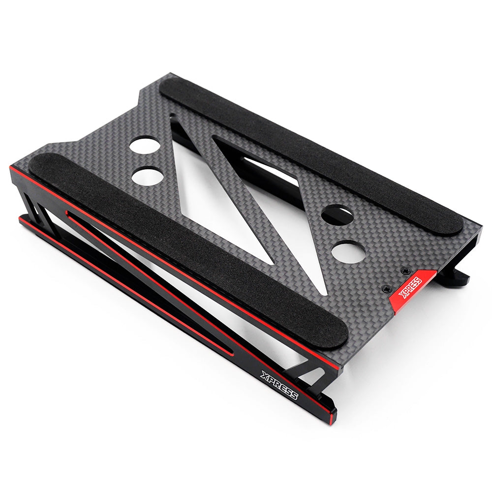 Introducing the Xpress Car setup stand featuring a carbon fibre top plate and with aluminum side rails! Carbon Fibre was chosen as the top plate as it is less prone to bending when compared to aluminum allowing for a more sturdier car stand. Also has pre drilled holes which allows this car stand to act as a shock stand for rebuilding both big bore and standard shocks! Comes with foam padding to provide anti-slipping when placed on your pit table!